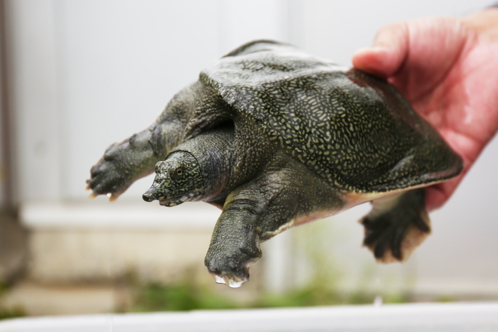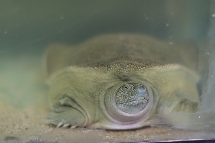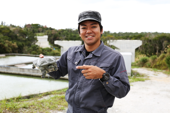 「小さい頃から、魚や亀など水槽でいろいろと飼っていました」。と、事務所内には大きなすっぽんや熱帯魚が泳ぐ大型水槽をしっかりディスプレイ(笑)。大がつく(特に水辺の)生物好きは、かねてから社内で知られる存在でした。それを耳にした、長濱 徳松(ながはま とくまつ)会長直々に白羽の矢が立ち、2011年“すっぽん計画”が立ち上がりました。「使命を受け、全国の養殖場を視察し、九州の業者から協力を得られました。最初、試験的に池と仮設テントを作り、50匹仕入れ、半年飼ってみたところうまく行ったので、1,000匹を取り寄せ本格的に事業展開となりました」。0からのスタートで、苦労もあったのでは?「いや、それが、、全然無くて(笑)。順調に進みました」と、あっさり。「おかげさまで、現在は、ここ読谷に2万、本部町でも3万と、計5万匹を養殖しています」。仕入れはもちろん、捌きから加工まで、一連の流れを統括する野原さん。「一般に、すっぽん肉というと、ちょっと泥臭さが気になることも少くありません。しかし、弊社では、徹底した生産管理、綺麗な地下水、高品質なエサ、最適な気候、サンゴ砂の浄化作用とミネラル、という5つのポイントにこだわり、これまでに無い理想的な味わいを実現しました。詳しくは、関連会社の沖縄黒糖が運営する『すっぽん館』HPをご覧下さい」。幼少からの経験値、生き物への素朴な興味が、大きなプロジェクトを支える原動力に…。言葉一つひとつに説得力がありました。