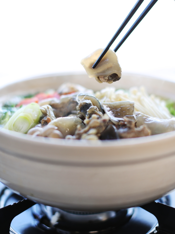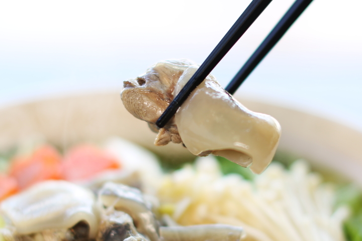 食し方は、各自好みでOKですが、盛り付け例としては、一般的な鍋と同じく、白菜、ネギ、ニンジン、春菊、豆腐に、エノキやシメジなどは相性抜群。また、沖縄っぽさを演出すべく、軟骨ソーキ等を加えるのも一興です。程なく沸騰し、すっぽん肉がぐらぐらと揺れたら、召し上がれ!