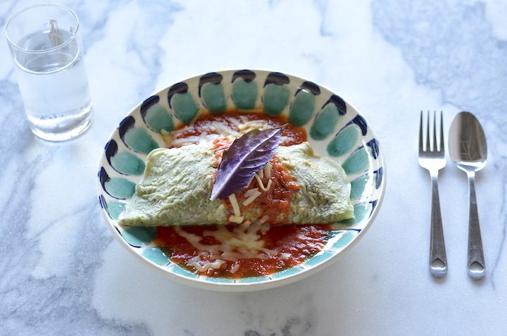 “3番目に紹介するのは、「うちのやまち」の『須久名ブリトー』(620円)。タコスで評判の店、うちのやまちからは知念半島にそびえる霊山、須久名山(すくなやま)が望めます。古事記に登場するスクナヒコという医薬の神様と名前が似ていることから、スクナヒコが妙薬を求めてこの山を訪ねた、という伝説もあるのだそう。その逸話にちなんで、沖縄の薬草であるハンダマーを生地に練り込み、具材に使ったのがこのメニュー。商品化にあたっては、長命草などいくつかの“島ハーブ”を試したようですが、色と味の面でブリトーと相性がいいハンダマーに落ち着いたということです。