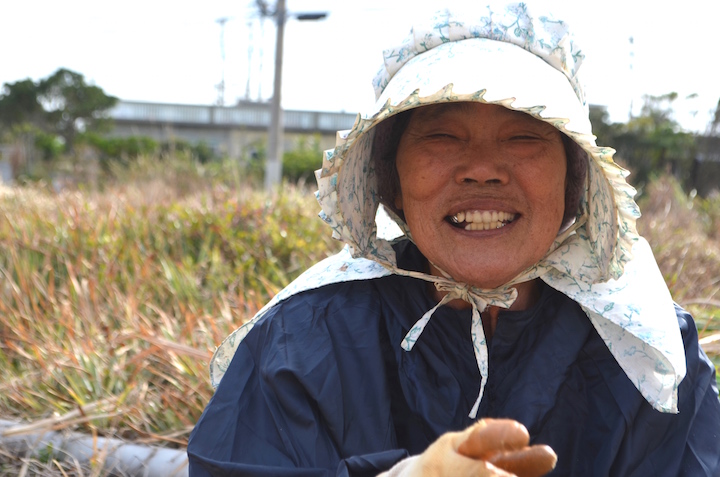 埼玉から来た彼女は大のおばあちゃんっ子だという。高校まで暮らしていた福島でも、小さい頃から家族でおばあちゃんの家に遊びに行っていたそうだ。そんな彼女と、底抜けに明るい沖縄の“おばあ”との間で、久しぶりに再会した実のおばあちゃんと孫のようにほのぼのとした会話が始まった。