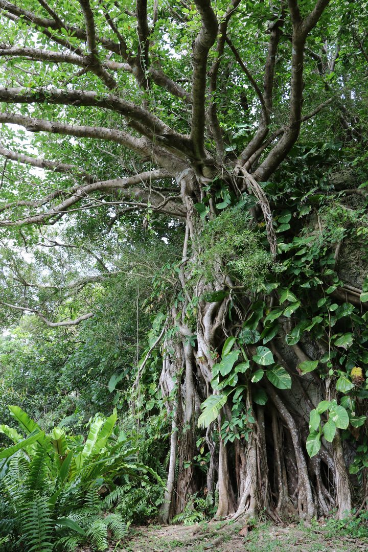 そこは庭園の中腹にある見晴らし台。満潮には何色もの青を重ねたグラデーションの海が広がり、干潮には円環状のサンゴ礁を見られる場所。振り返るとこの場にも樹齢150年の立派なガジュマルが! ここでひと息ついて展望台へ進みます。