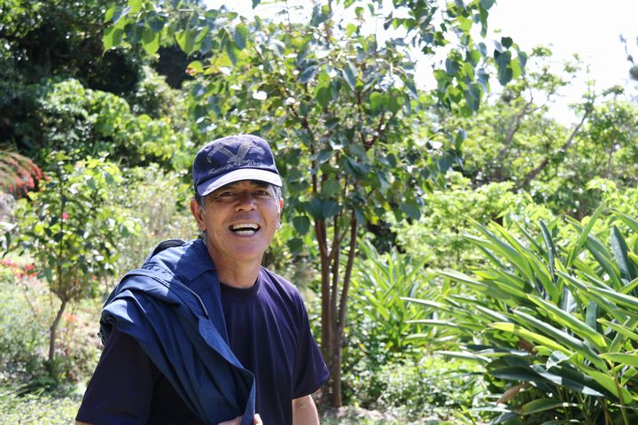 その道中、ばったりお会いしたのは、オーナーの稲福信吉(いなふくのぶよし)さん。「いい日に来たねぇ。今日は海も緑も最高だよ」とにっこり。実は数日前まで寒い日が続き、雨もぱらぱら。この日は久々に晴れたので、植物たちが光を浴びて気持ちよさそうに葉を広げているよと教えてくれたのです。