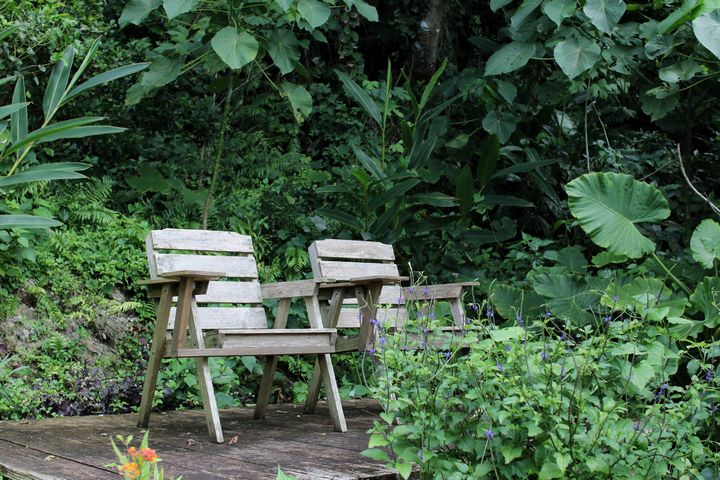 坂道が続く庭園のあちこちには椅子が置いてあり、ひと休みしたり、その場から海や木々を眺めたり。思い思いに過ごせます。
