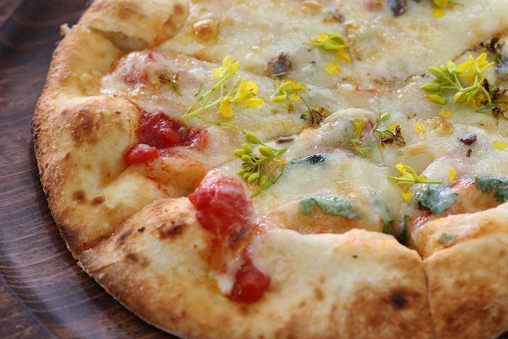 敷地内に自生する季節の野草と、アンチョビ代わりに使ったスクガラスの塩味がアクセント。スクガラスとは、沖縄近海で獲れるアイゴの稚魚の塩漬けのこと。加えて今回は黄色い花が散らされて、春香るピザが運ばれてきました。