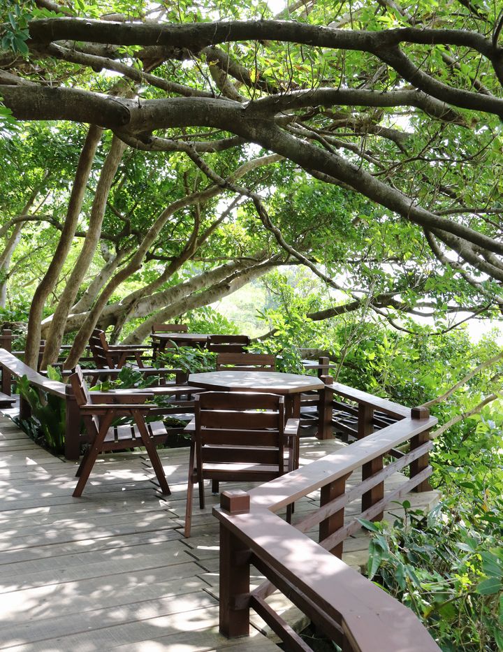 石窯小屋のそばには、まるで森にいるかのようなテラス席もあり、この場所から見る海もまたいいもの。