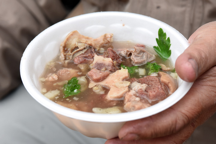 祭り会場では、栄養価の高い滋養強壮食品としても人気のヒージャー汁が