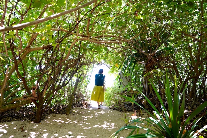 「旬家ばんちゃん」は、石垣島(いしがきじま)白保(しらほ)集落内に佇む一軒家を改装したレストランです。お店は海岸沿いにあり、庭先から緑の防風林を抜けると目の前には白保の青い海が広がっています。