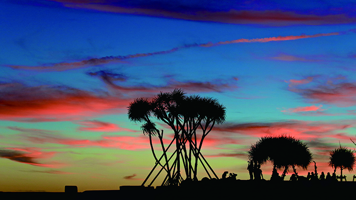 「ウチナーンチュという自覚はある。でもそこに縛られるつもりはない」という自由な発想を抱きつつ、足元に息づく小さな島の輝きを大切に奏でてきた照屋林賢。彼が語った夕陽の話を思い出しながら、「カラハーイ」の近くにあるサンセットビーチを訪れると、美しい夕景が広がっていた。沖縄の美しさを宿したりんけんバンドの音楽は、こういうところから生まれてきたのだなと夕陽と重ね合わせて考えた。そして今、林賢の中にあふれる希望が、どんな音楽に結実していくのか。これからも長く続くだろうりんけんバンドの音の旅が、ますます楽しみになった。