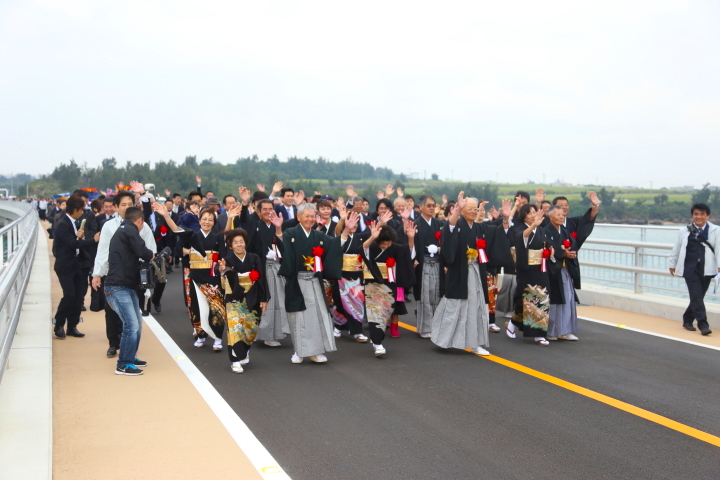 橋で結ばれた両島在住の3家族を先頭に、宮古島側から伊良部島へ向けて、