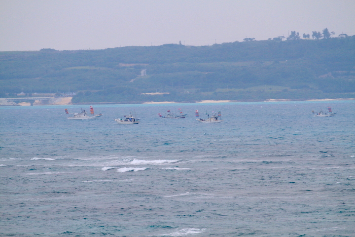 伊良部、宮古島、池間の各漁協の大漁船団が出航。橋の開通をド派手に盛り上げていました。