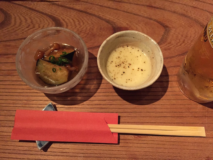 まずはビールで乾杯。今日のお通しは、ナスの揚げ浸しと白菜のポタージュ