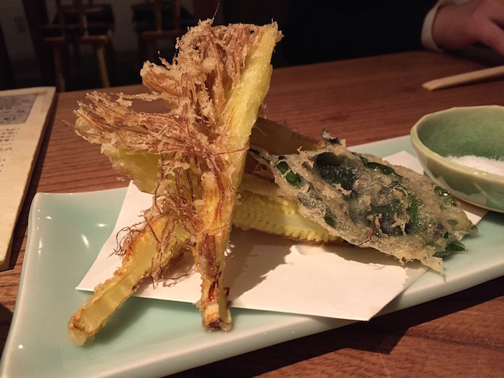 天ぷらは季節の県産野菜で。ヒゲまで一緒にサックサクに揚がったヤングコーンの天ぷらなんて初めて!