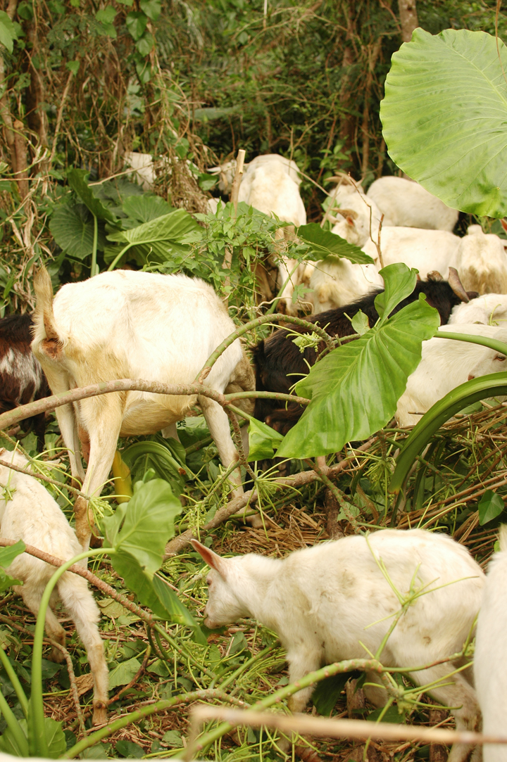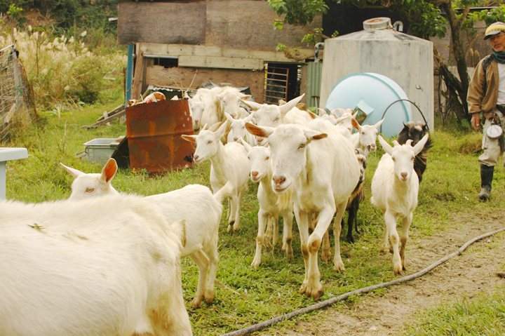牧場を経営する外間(ほかま)夫妻が毎日40頭ものヤギを引き連れて山の上まで放牧に行きます。