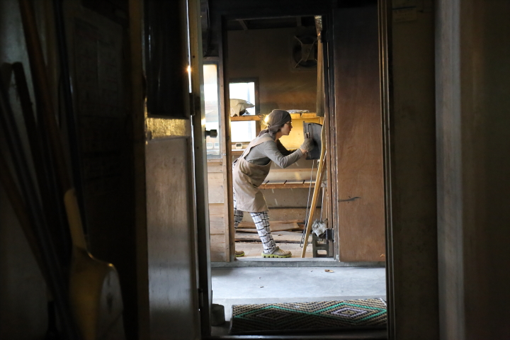 早朝、石窯にまきをくべ、薄闇の中に炎が揺らめく様子を撮影したり、