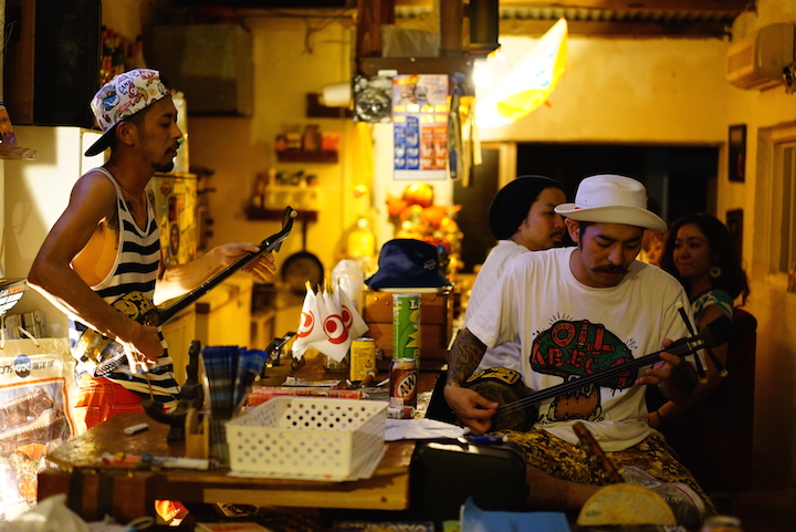 Ryuukyu.comでのひとコマ。若者が集い、三線をかき鳴らす photo by Jun Kasuya