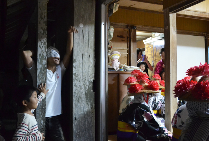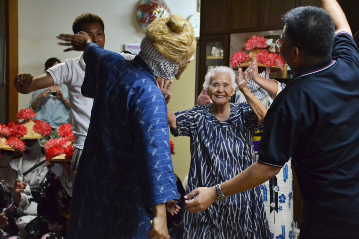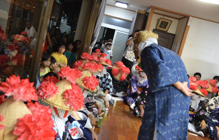 花笠をかぶった集団は、ファーマーと呼ばれるふたりの子や孫たちです。