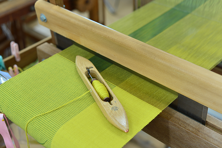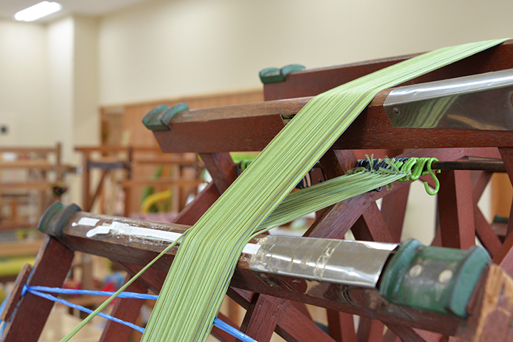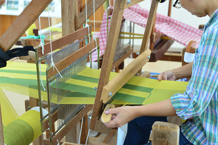 織り機で染め上げた糸を織り上げる行程を見学したり、