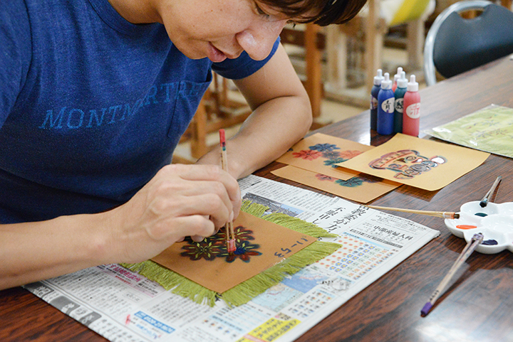 “染め”の体験では好きなデザイン型を選んで自分好みの色を使用し15分程度。