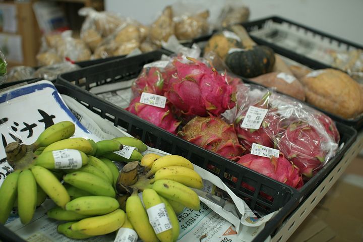 地元のおじぃやおばぁが作る旬の野菜やフルーツを並べ、