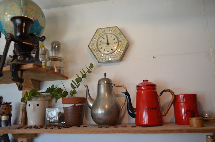 「ランブルポットってあるでしょ、コーヒーを淹れるときに、お湯をほそーく落とせるやつ。これはね、カフェドランブルのオリジナルのポットなんですよ。で、こっちはね、フランスの鋳物の自慢のポットなんです」手に入りにくい値打ちものカードを自慢する子どものように目を輝かせて「自慢」の逸品を見せてくれました。