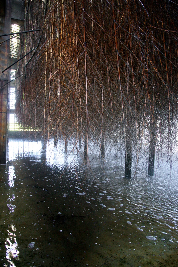 海水からくみ上げられた塩は、細い枝を下げた無数の竹を伝い塩分を凝縮させます。