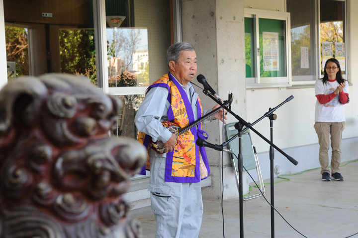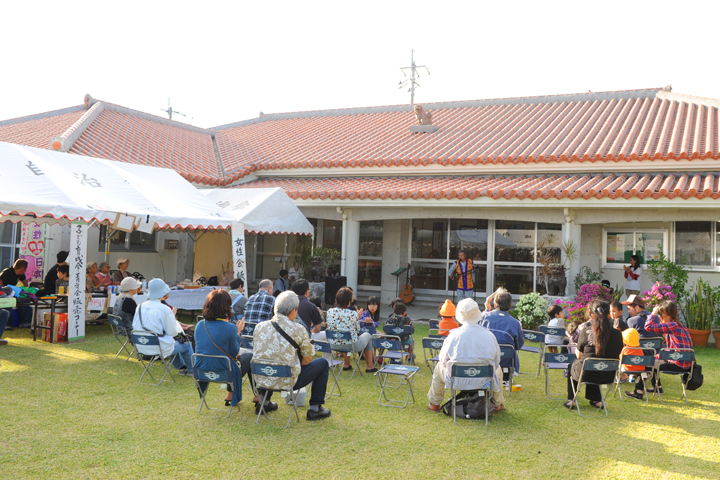夕方からは、公民館の庭でミニコンサートが開催され、花咲爺会メンバーの米須清光さんが歌三線を披露したり、北中城村とゆかりのある若手ミュージシャンの歌を聴いたり。