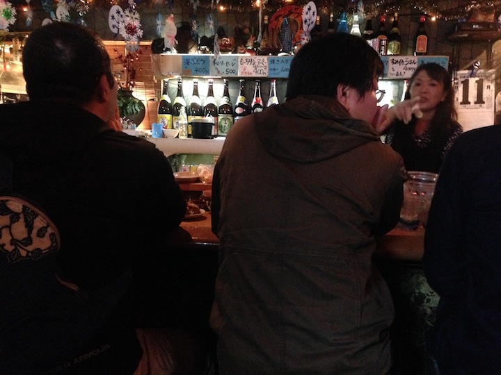 狭いカウンターで片寄せ合ってグラスを傾け、山羊をつまむ紳士たちの背中を