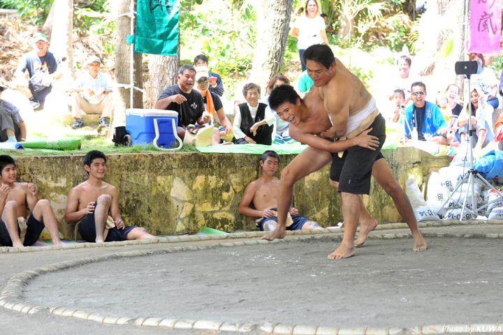 沖縄角力は、土俵のかわりに砂が敷かれ、相手の肩が地面についたら勝ちなのですが、廻しはなく柔道着のような道着を着用し、最初から右四つに組んで勝負が行われます。