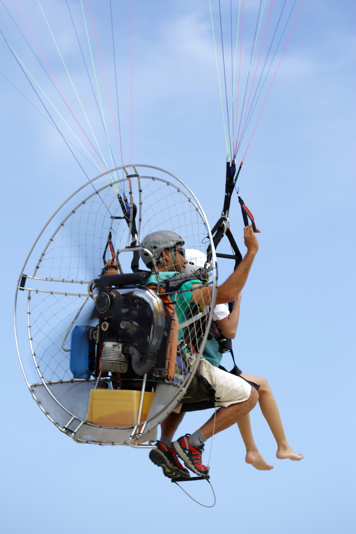 2〜4枚のプロペラ付きエンジンを背負ったインストラクターの前に座るだけ。
