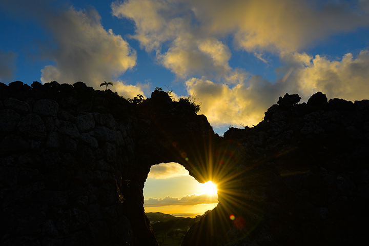実は、1年の中で最も昼間が長い「夏至」の日の前後に、城門から日の出の光が差し込む、幻想的な光景を見ることができます。神の島、「久高島(くだかじま)の方向から太陽が昇り、岩を重ねて創られた玉城城址の城門、通称“太陽の穴”から差し込む光は、城門から一直線上に創られた玉城城址内のヒヌカン(火の神)を照らし出すのです。