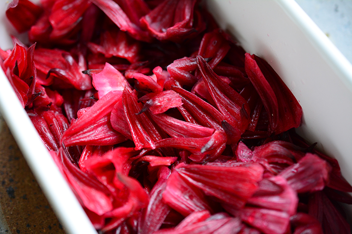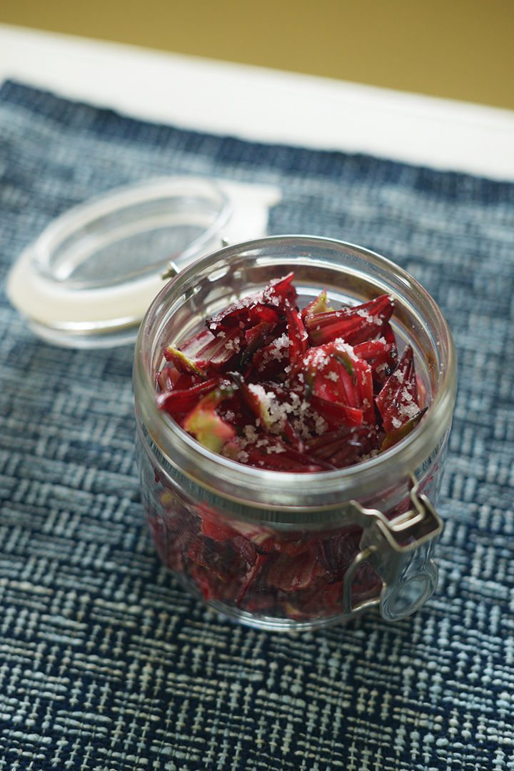 2~3日すると、しんなりとしたローゼルの塩漬けが完成します。