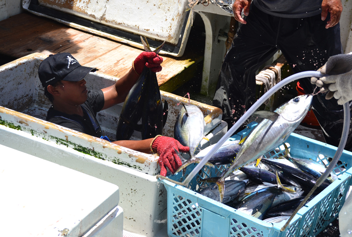 この日漁協にいくと、ちょうどカツオ船が戻ってきたところでした。直営の居酒屋・海人居酒屋 源を石垣島内に7店舗も持つ、丸源水産の船です。