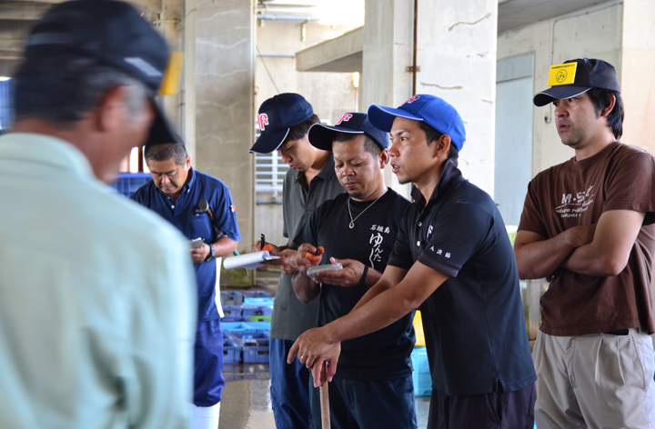 サシミ店の店主たちは、大きなカツオを狙って争奪戦。丸源のみなさんは、スーパーに卸すカツオをその場で下ごしらえしていきます。