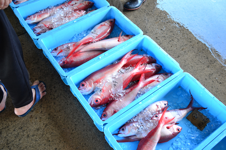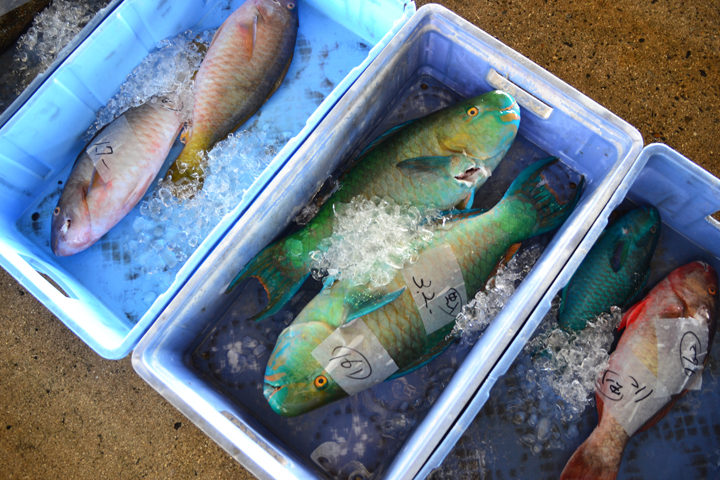 セリにかけられるのはイラブチャーやミーバイ、アカジンなど南国特有のカラフルな魚たち。見ているだけでおもしろいです!