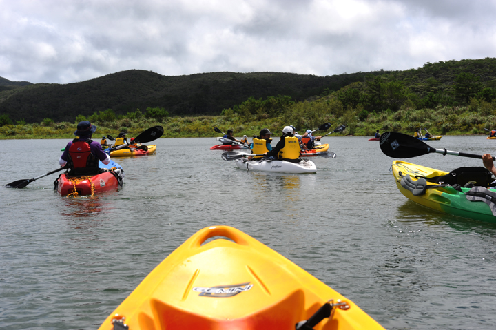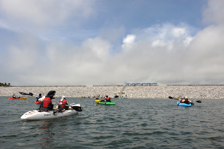 ダム湖(ぶながや湖)では、湖面をカヤックで漕いで遊んだり、