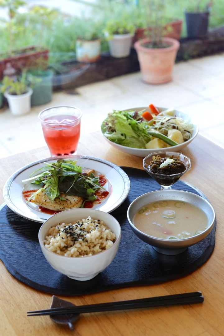 何より、リピーターに支持されているは「体の内側から元気になる!」をコンセプトとしたお食事です。県産の新鮮野菜を中心としたヘルシー料理は、いずれもシンプルで上品な味付け。老若男女、誰でもおいしくいただけること請け合いです。ランチの一番人気は、玄米ご飯&メイン(白身魚の特製トマトソース焼き)の他に、前菜5種とスープが付くビュッフェスタイルの「ヘルシープレート」(1,188円税込)。手の込んだ野菜料理を、あれこれ、そして好きなだけ楽しめます。特に、手づくり味噌の豆乳スープは、ヘルシー度満点!と、評判です。但し、人気メニューに付き、早ければ午後2時には売り切れてしまうこともあるので、ご注意を。
