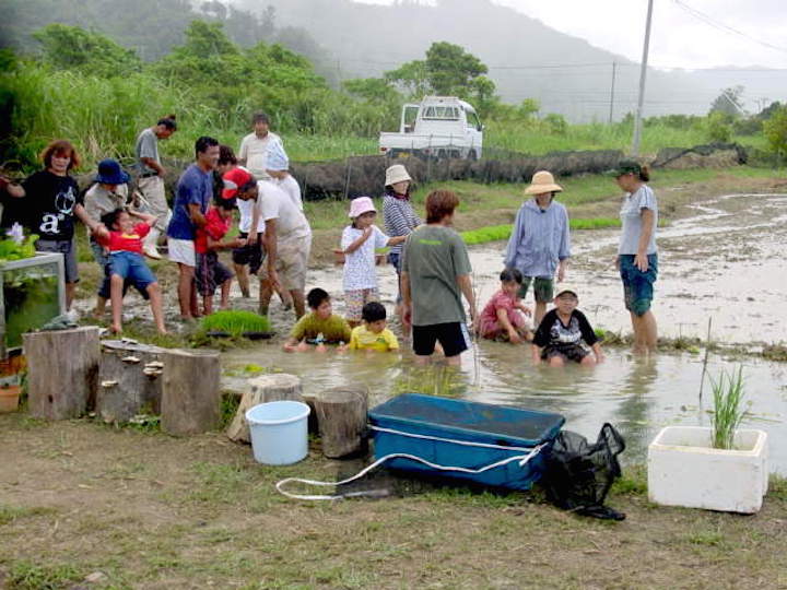 ハブのように蛇行した畦道(あぜみち)。英国庭園のように中央にしつらえられた円形の池。水草やホテイアオイのためにあちこちに「配置」された水溜まり。メダカやゲンゴロウ、ミズスマシが戯れているのはもちろんのこと、森につながる水路からはタナガー(沖縄の手長エビ)や闘魚が流れ着くオアシスのような場所。農作業体験に飽きた子どものために用意されたブルーシートを敷いた手作りのプール。