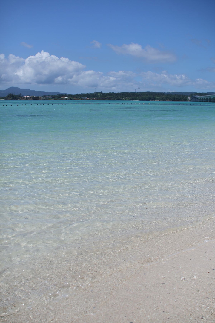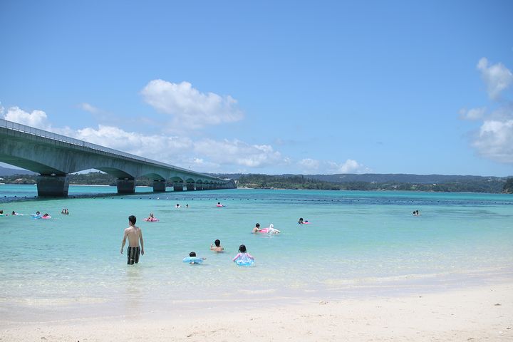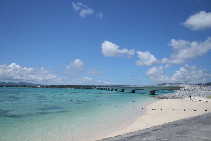 人気スポット古宇利ビーチ。古宇利島の入口にあるエメラルド色の海