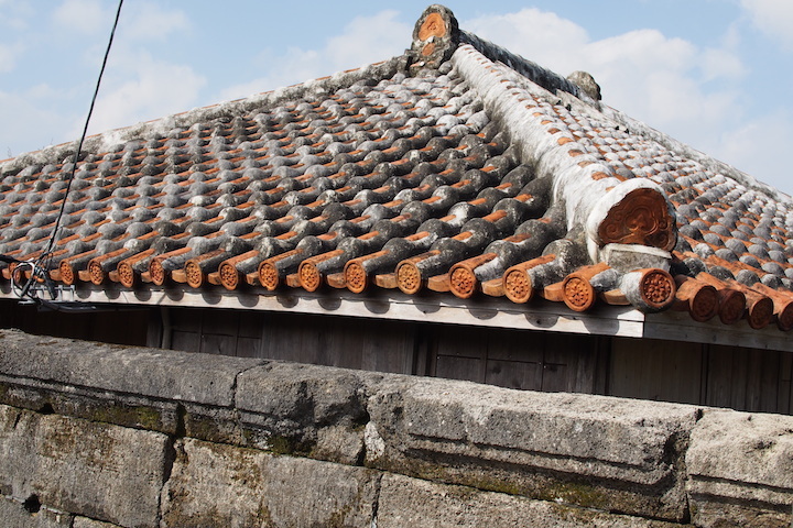 昔ながらの佇まいが残る集落内を散策していると赤瓦屋根のいかにも沖縄らしい光景です。よく見てみると、石垣にいくつかの穴が空いています。これは、先の沖縄戦で受けた銃痕跡で、今もそのまま歴史遺産として保存しているのだそう。