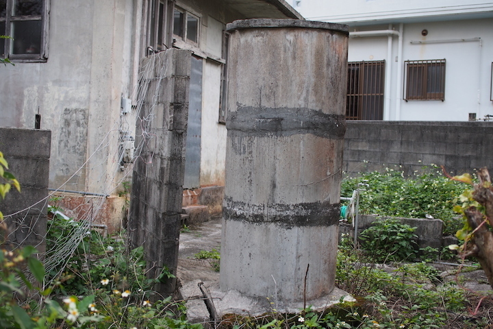 このコンクリート製の円柱のようなものは、雨水を貯める水タンクです。お湯を沸かす時は必ず、家の外にあるこの水タンクに“天水(てんすい)”を汲みに行かされたもの。周りを海に囲まれ大きな川もない沖縄では、真水は大変貴重なもの。たいていどの家も敷地内にこの水タンクがあったものです。