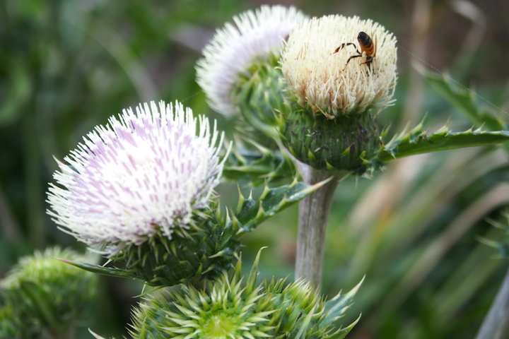 こちらは、浜辺の散歩途中で見かけたシマアザミ。国内では奄美大島と沖縄でのみ見ることができます。花は主に2~5月に咲き、海外沿いの砂地や岩場で出会えます。