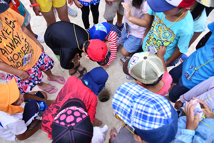 実際にビーチの砂場で産卵する巣穴堀りも体験!!