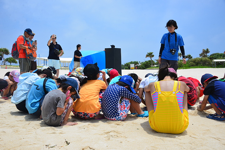 ウミガメは60cmほどの深さの穴を掘って卵を産むそうで、掘ってみると思ったよりも深く感じます。参加した子ども達も、「なかなか60cm掘るのは大変だな〜。カメさんすごいな〜」と感心する声があがったり、親子や、お友達で楽しく穴を掘ったり、誰が早く60cm掘れるか競争したり、巣穴堀りを楽しみます。