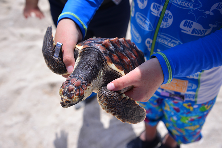 放流する仔ガメ1匹、1匹に標識を付けます。海洋博公園では1983年よりウミガメの標識放流を実施していて、1985年に放流したアカウミガメが約1万キロ以上離れたアメリカのロサンゼルス州サンディエゴ沖で発見されたこともあったそう! その後も国内外で沖縄発のウミガメが発見されているそうで、自分自身が放流したウミガメが、どこか遠くの海で発見されたり、まだ知られていないウミガメの生態発見に役立つかもしれないと考えると、なんだかロマンを感じます。