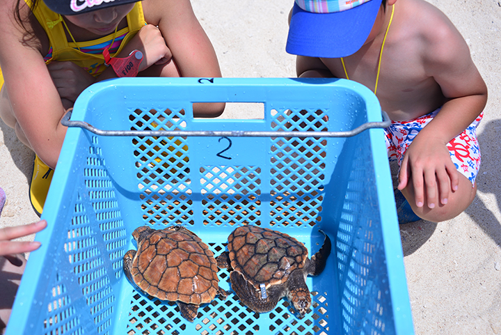 今回開催されたウミガメ放流会では、ウミガメ館で生まれ、1年ほど飼育した仔ガメ127匹(アカウミガメ72匹、アオウミガメ51匹)が放流されました。
