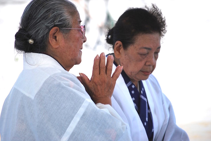 メインイベントのハーリー競技に先立って、ツカサンマ(司母)と呼ばれるカミンチュ(神人)とともに主催者のみなさんが集落内に点在する御嶽(うたき)とよばれている祈りの空間を巡って、行事の無事を祈願します。布干堂地区では4つの御嶽を周ったあとに漁港で御願(うがん:お祈りのこと)を済ませ、会場のパイナガマビーチに移って祭の準備が始まります。