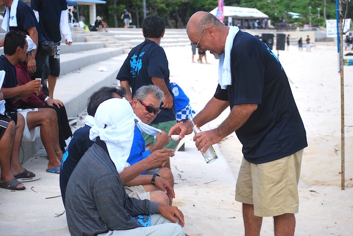 実行委員に杯を進める布干堂船主組合の知念秀夫(ちねん・ひでお)組合長。25年ほど前から海神祭に関わってきたそうです。「みんなが一丸になって海神祭を盛り立てる姿が毎年たまらない」と笑顔で語ってくれました。