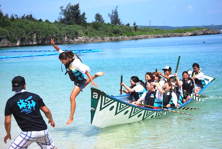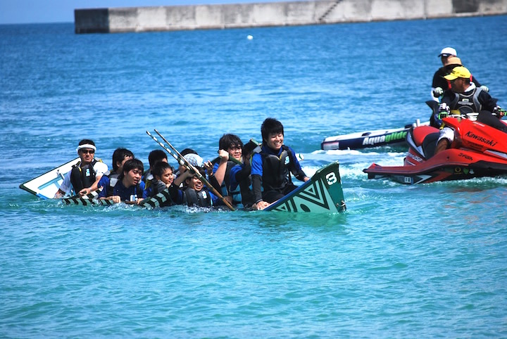 代表選手が船首から飛び降りて、先に砂浜を踏んだチームが勝ち。