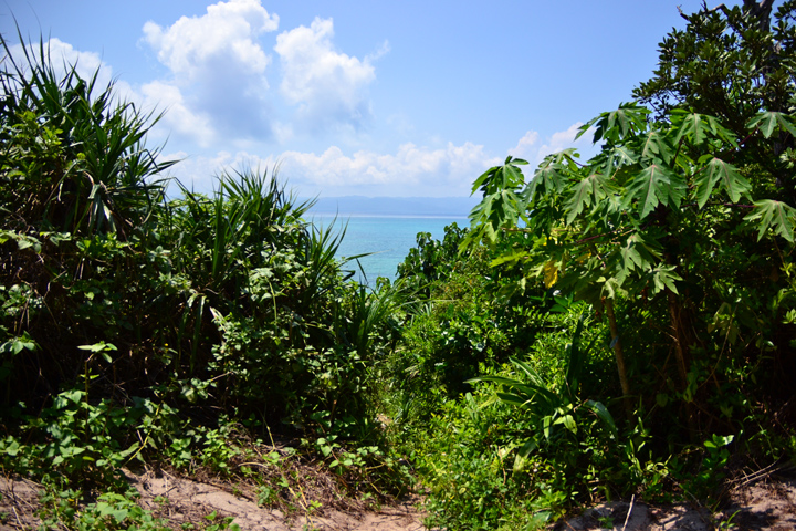 また右に、浜の案内板のある森に入ると、緑の先に海のグラデーションが見えてきます。