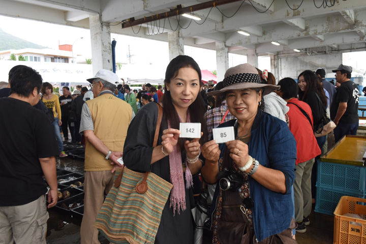 まずセリに参加するには、整理券をゲット。はりきって1番目に並んでもらった番号が83番だったとなげく、地元南城市から参加の長浜さん(写真右)。でも御心配なく、あくまでもセリに参加するために配られたその日のID番号のようなものなので、何番でも大丈夫!